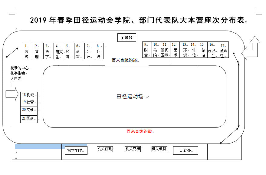 集团第17届田径运动会将于4月11、12日(星期四、五)举行。若遇下大雨,确实影响比赛,则运动会暂停举行,教师、员工照常上课,行政人员照常上班(请密切关注校园网通知和公司广播通知)。根据抽签顺序,公司在第21位出场(在社管公司之后,机关工会之前)。请老师们于4月11日早上8:00准时到校前广场集中,参加入场式。现将有关事宜通知如下: