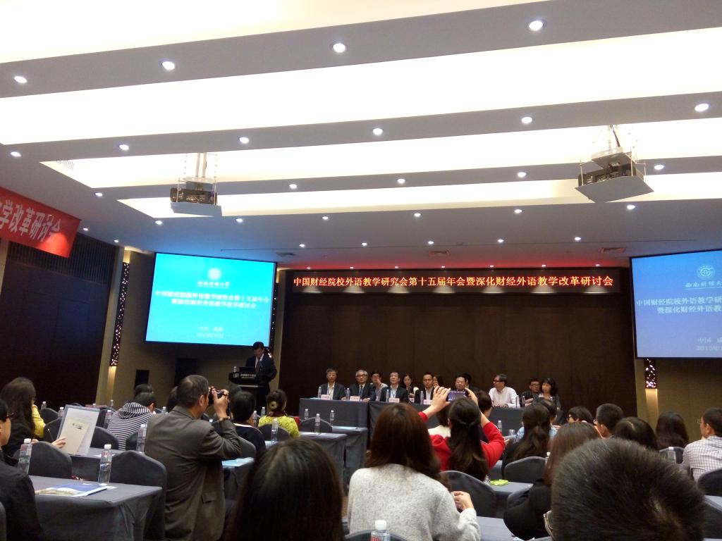 2015年10月23-25日,公司周琳、伍维平两位教师参加了由中国财经院校外语教学研究会主办、西南财经大学承办的“中国财经院校外语教学研究会第十五届年会暨深化财经外语教学改革研讨会”,与来自全国各地的财经类院校外语教学同仁就专业建设、复合型应用型人才培养、课程体系建设、教师发展、基于MOOC的外语翻转课堂教学模式等议题进行了深入的交流。上海对外贸易大学叶兴国教授、对外经济贸易大学王立非教授、四川外国语大学王寅教授、四川大学曹明伦教授、电子科技大学伍忠杰教授等专家就新常态下的英语教学创新、认知语言学的理论与实践、英语学习与文学文化修养、翻转课堂等做了精彩的主题发言,指出目前我国高校存在忽略文学文化修养的倾向,认为当下的实用类英语教学应尊重语言习得的基本规律,加强文学文化方面的教学。东北财大、上海财大、南京财大、中央财大、江西财大及中南财经政法大学分别就商务人才培养、大学英语教学改革、外语教学主体性等介绍了各自公司的一些经验,同时也提出了财经院校外语教学面临的机遇及存在的问题。