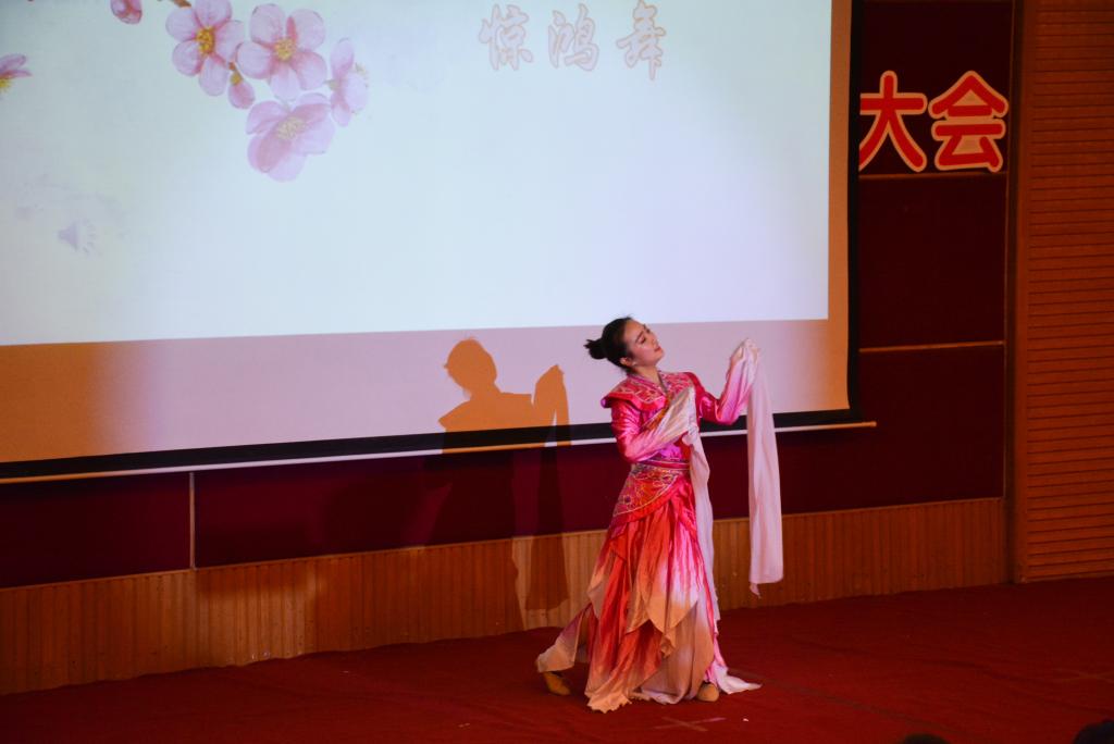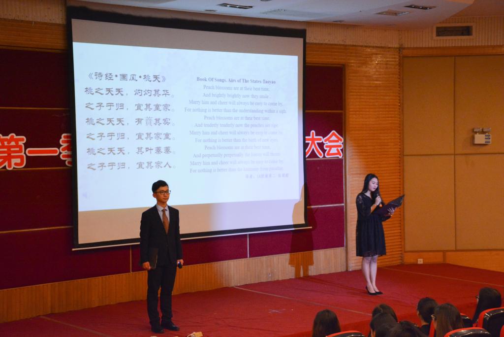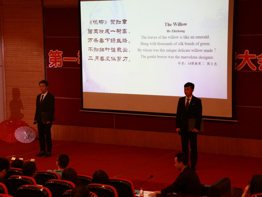 时逢谷雨时节,译读大会在清代诗人、画家郑板桥“几枝新叶萧萧竹,数笔横皴淡淡波。正好清明连谷雨,一杯香茗坐其间” 的中英诗句中拉开序幕。同学们纷纷化身“朗读者”,为现场观众带来了中国经典诗词的中英文译读。李延年的《李延年歌》、王昌龄的《闺怨》、崔护的《题都城南庄》、贺知章的《咏柳》、《诗经•国风•桃夭》、顾城的《小巷》、毛泽东的《卜算子·咏梅》、王昌龄的《闺怨》等八篇经典古诗词中的名句被翻译成优美的英文,这些最熟悉、最打动人心的诗词,精彩独到的翻译,激发了现场观众共同的记忆与情怀,带领大家在“世界语言”中领会中国诗词的唯美。朗诵间隙,校老员工艺术团舞蹈分团成员、2016级商务英语专业的刘婷娴同学带来《惊鸿舞》,古典的音乐、柔美的舞姿把观众拉到了古风古韵的诗词世界。受《中国诗词大会》启发,译读大会现场还设置了精彩绝伦的“飞花令”环节,随机邀请现场同学两两一组“斗诗”,分别以“春”、“雨”、“花”为主题进行了三轮比拼,每组选手进行了至少六轮的PK,许多生僻的诗句他们都信手拈来,让人赞叹,对诗过程酣畅淋漓,现场观众拍手称快。译读大会还专门设置了向首位获国际翻译界最高奖项之一的“北极光”杰出文学翻译奖的亚洲人许渊冲老先生致敬的环节,两位同学声情并茂地朗读了毛泽东主席的作品《沁园春·雪》和许渊冲老先生的同名翻译作品,气势磅礴、震撼人心。