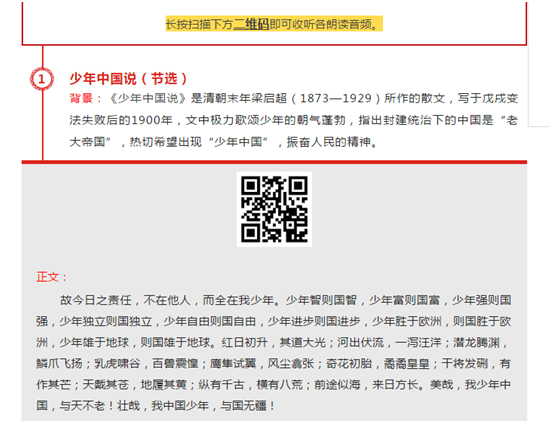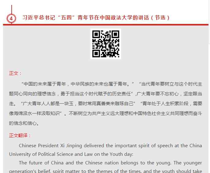 团日活动选取了《少年中国说》、毛泽东主席《唯心历史观的破产》文章节选、邓小平同志1979年改革开放之初的讲话、习近平总书记“五四”青年节在中国政法大学讲话、入团誓词等五段篇章,组织雷锋团支部成员在专业教师的指导下将节选内容翻译成英文,该支部成员纷纷化身“朗读者”,用中英双语对这五个选段进行了朗读,记录并呈现在外语公司分团委“工商外语人”微信公众号上。