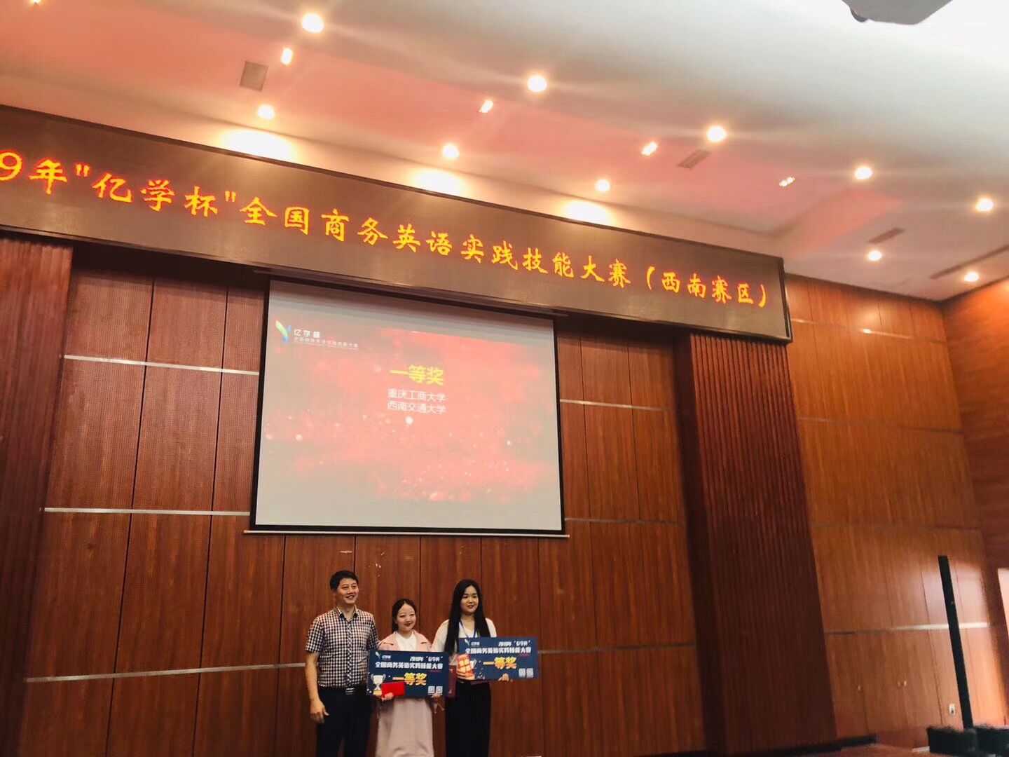 6月1日,2019“亿学杯”全国商务英语实践技能大赛(西南赛区)圆满结束。由公司外语公司商务英语专业杨爽、杨帆和杨怡雪3位同学组成的代表队,荣获一等奖。