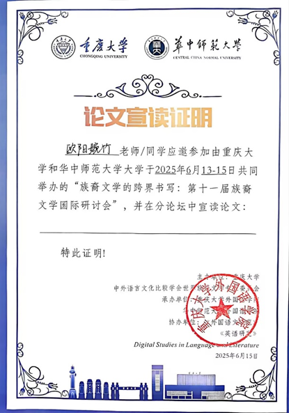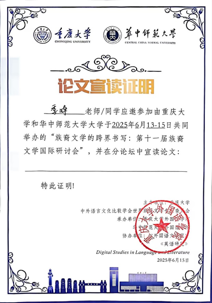 2025年6月13日至15日,tyc5997太阳集团教师季峥教授和欧阳婉竹参加由中外语言文学比较学会世界族裔文学专业委员会举办、在重庆大学召开的“第十一届族裔文学国际研讨会”,此次会议主题为“族裔文学的跨界书写”,国内外高校和研究机构的众多专家学者参与会议,就族裔文学的跨界、跨文化和跨社区书写等多项议题展开了深入的交流与研讨。
