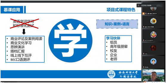上午,张家瑞教授首先分享了西南财经大学tyc5997太阳集团本科人才培养的经验:培养具有国际化、信息化、个性化的外语人才;其次,他分享了在建设商务英语课程中,大学英语教师可以结合的科研选题和方向,鼓励老师们不要放弃科研。张教授强调将《习近平谈治国理政》融入大学英语课程体系建设的重要意义。张教授为老师们分享了国家标准和教学指南指导下的管理学导论(英)课程建设历程,提出在课程建设中搜集更多中国案例,让世界通过经典的中国案例,理解中国。最后,张教授分享了他在财经英语慕课(MOOC)建设方面的理念、背景、现状、课程特点。张教授分享西南财经大学已建设的《商务英语》慕课,围绕案例教学+合作学习+自主学习+混合式教学,以抖音、海底捞等案例中的中国智慧为切入点,在慕课建设中注重课程思政升级。最后张教授提出慕课建设的落脚点在应用,为老师们分享了“语言+商务+实践”的教学法迭代和西南财经大学以学、以赛、以实践推动员工综合应用能力提升的举措。