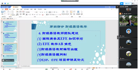 此次财经英语课程建设工作坊,专家们结合自身丰富的商务理论和实践经验,从国家和区域重点工作,结合公司的实际情况,为我们财经英语课程建设、教师团队建设、区别化特色发展,都提供了非常有益的意见和建议。通过参加财经英语课程工作坊,老师们增长了见识,开阔了思路,廓清了公司财经英语课程建设的目标、方向和特色。下一步财经英语课程团队将积极开展“理解当代中国”系列教材融入财经英语课程建设,为建成有区域特色、校本特色的财经英语系列课程而努力奋斗。