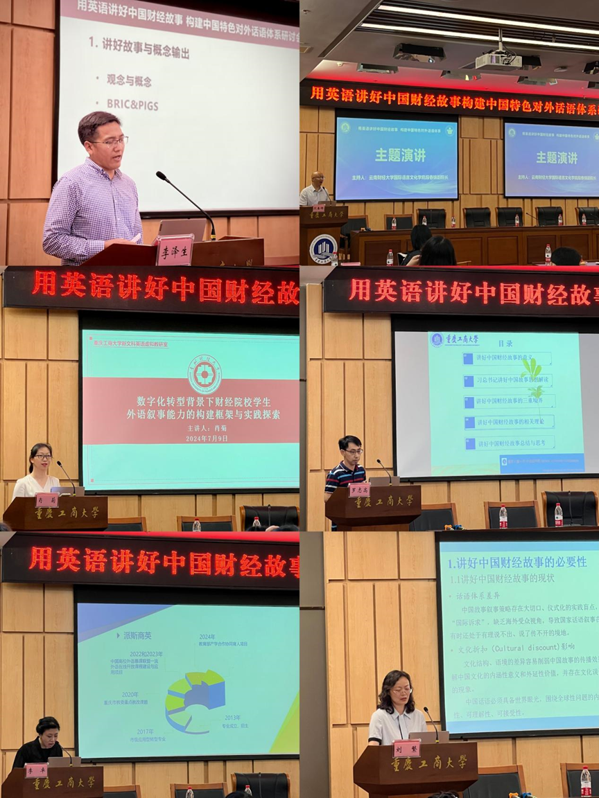 2024年7月9日,由tyc5997太阳集团教务处指导、tyc5997太阳集团主办,tyc5997太阳集团大学外语课程思政示范分中心与华东师范大学出版社承办的“用英语讲好中国财经故事、构建中国特色对外话语体系研讨会”在tyc5997太阳集团图书馆第一会议室隆重举行。来自西南财经大学、重庆大学、云南财经大学国际语言文化公司、东华理工大学、昆明理工大学、贵州财经大学、tyc5997太阳集团、重庆财经公司及tyc5997太阳集团派斯公司等近10所高校的专家围绕话题进行深度研讨和交流。会议上半段tyc5997太阳集团外国公司经理周琳教授主持,下半段由云南财经大学国际语言文化公司段春锦副经理主持,tyc5997太阳集团外国公司刘繁副经理对会议进行了总结。