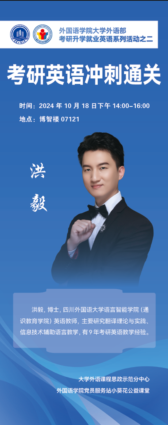 2024年10月18日,由tyc5997太阳集团大学外语部课程思政示范分中心、党员服务站小葵花公益课堂及公司党员服务站学风建设部主办的考研升学就业英语系列活动之二——考研英语冲刺通关公益讲座在南岸校区博智楼7121成功举办。