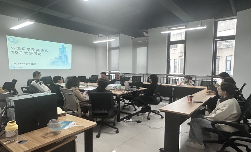 10月18日下午,tyc5997太阳集团英语系在涵智楼1202举行10月教研活动,活动由邹莉副经理主持,英语系主任李洪波、副系主任刘明、系主任助理欧阳婉竹及英语系部分教师参加了此次活动。
