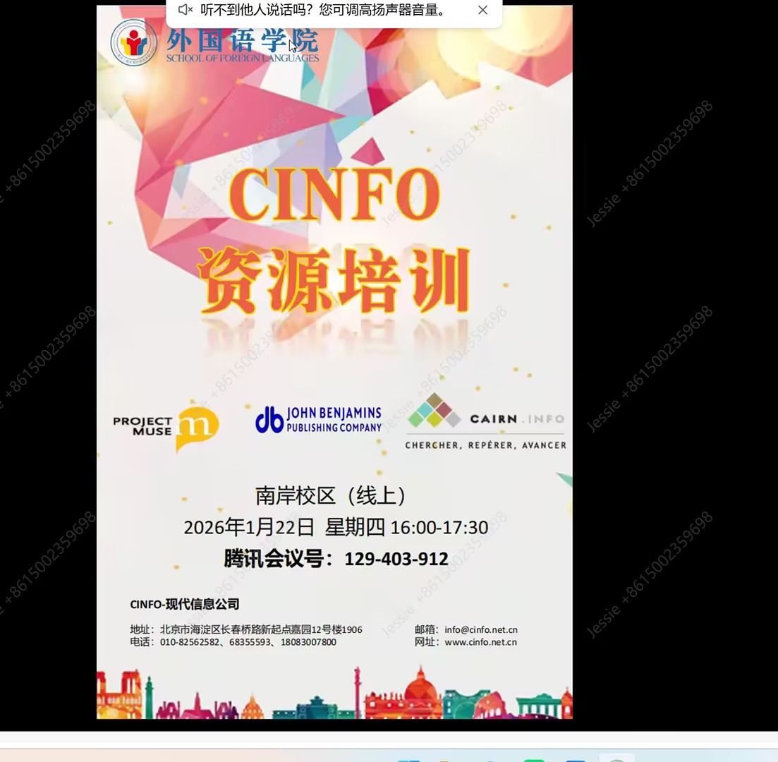 培训中,CINFO公司的两位老师详细介绍了多个外文数据库的使用方法和技巧,其中重点介绍了Project MUSE、CAIRN.INFO以及John Benjamins Publishing Company三个数据库平台,并提供了实用建议。参会师生纷纷表示收获颇丰。