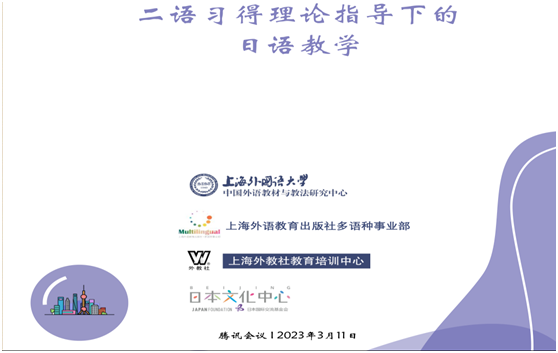 3月11日,由上海外国语大学中国外语教材与教法研究中心、上海外教社教育培训中心,联合北京日本文化中心(日本国际交流基金会)共同主办的“二语习得理论指导下的日语教学”2023全国高校日语教师高级研修班在线上如期举行。研修活动邀请了来自国内外知名专家,结合日语教学与研究领域最新的研究成果,就二语习得理论、日语教学等内容进行深入探讨,全国各所知名高校的数十位日语教育工作者参与学习并讨论。tyc5997太阳集团日语教师李小姝老师应邀参会。