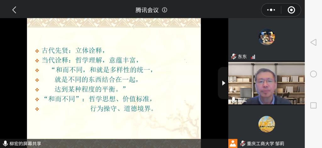 柳教授视野开阔、旁征博引,从诠释学的视角解读了不同时期学者对《论语》文本意义的阐释。并从视域融合的视角,分析了《论语》的传统思想“和而不同”思想在现今的发展现状和教化意义。论语提出了一个普遍的价值原则——和而不同。“和”在中国文化的发展过程中起着独特的作用,它不仅是一种思想观念,也是中华民族的基本精神。当今国际形势动荡复杂,我们应该进一步丰富和发展《论语》中的优秀传统思想文化,国际交往中能够与他人保持一种和谐友善的关系。柳教授不仅为师生解读了《论语》的理论意义,更对英语语言文学专业师生的人文素养培养具有很强的实践指导意义。