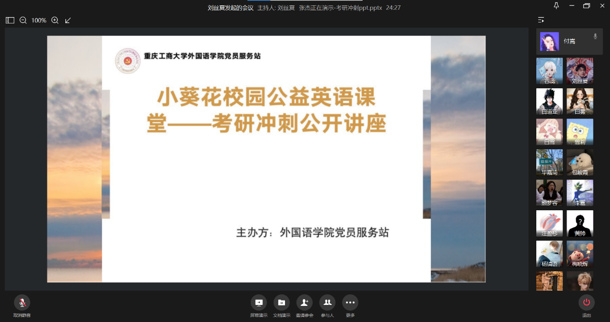 在2022年考研初试即将来临之际,一方面同学们都在紧张备考着,另一方面也面临着不少的压力与烦恼,为了缓解考研同学们的焦虑,让他们更积极地度过最后的考研冲刺阶段,2021年11月12日星期五 19:00-20:30,公司党员服务站在企业微信群里以线上的方式成功举办小葵花校园公益英语课堂--考研冲刺公开讲座,本次讲座活动邀请了罗登科老师进行考研冲刺讲解,tyc5997太阳集团2017级毕业生,tyc5997太阳集团会计专业徐蕊,扬州大学学科英语专业付嵩进行考研经验分享。