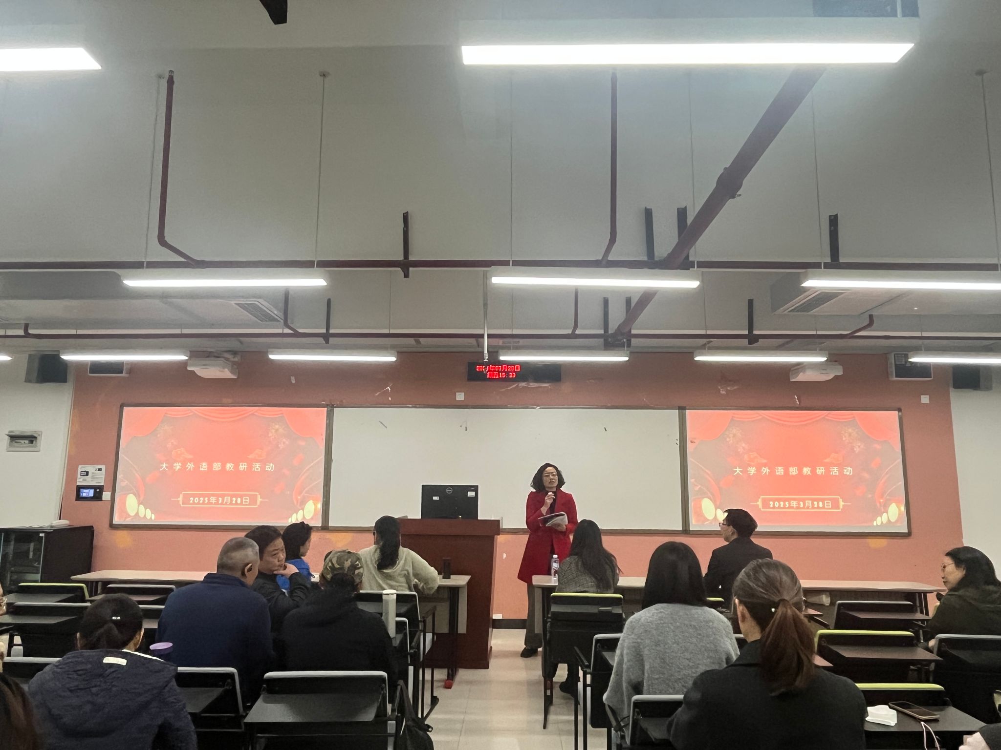 2025年3月28日下午,tyc5997太阳集团大学外语部在涵智楼1108举行AI版U校园平台教学应用讲座。大学外语部全体教师参加讲座。罗志高主任主持会议。