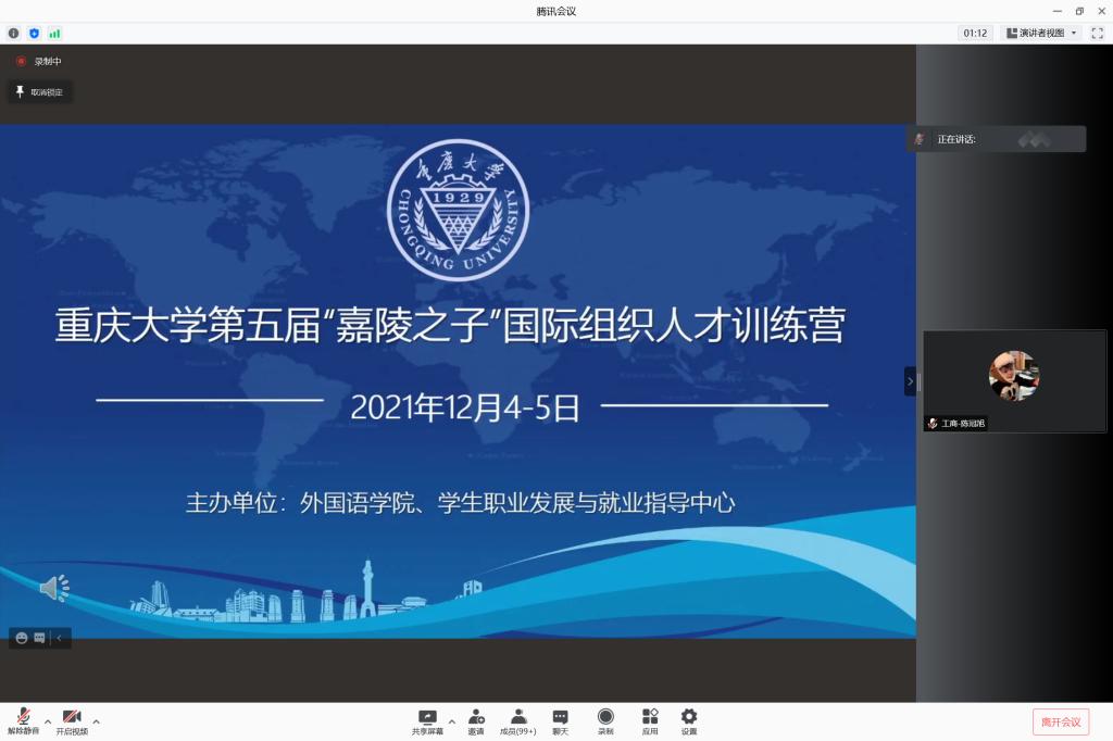 2021年12月4至5日,第五届“嘉陵之子”国际组织人才训练营在重庆大学成功举行。训练营共召开七场主题讲座,主讲人均是有国际组织相关背景的知名专家学者或实习员工。专家们结合自身工作经验为大家讲述了国际组织的运作体系与发展目标,培养了同学们的全球视野与跨文化沟通能力,为大家日后工作规划提供了新可能。训练营同时开展了相关文书撰写培训,为有意申请相关岗位的同学提供了宝贵的参考。