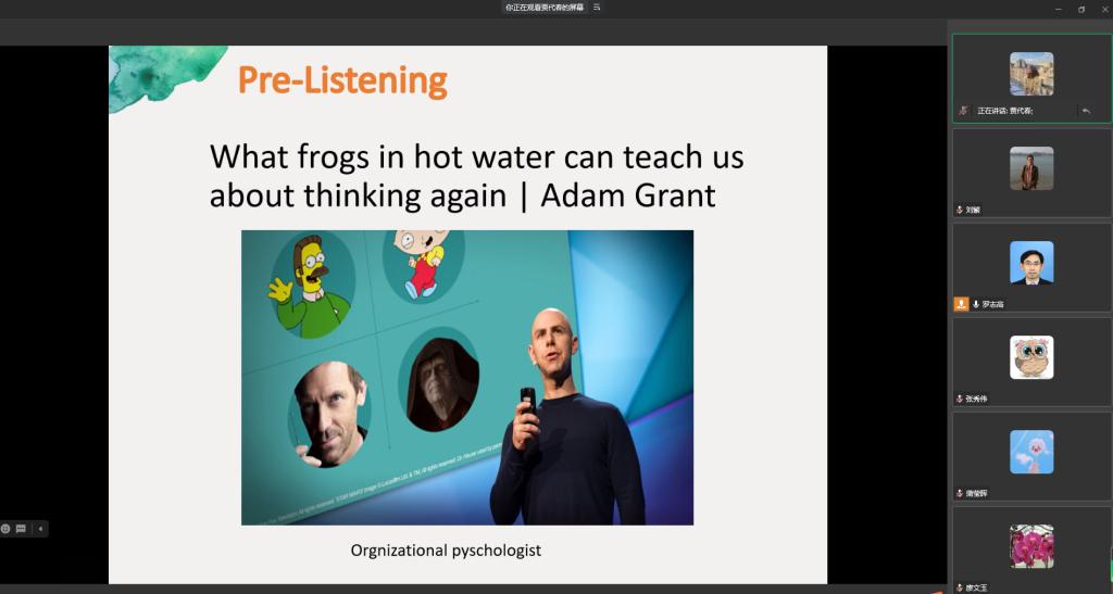 拟参加英语视听说组比赛的贾代春老师,进行了大学英语视听说课的教学展示。贾老师采用了任务型教学法,展示了从教学设计、教学方法到教学过程的各环节。杨玉兰教授、李伯利副教授和佘雨新老师充分肯定了贾老师的教学设计和语言基本功,建议贾老师在课堂活动设计中,尽可能更多使用现代教育技术,如课前给员工布置慕课学习、利用在线的测试进行课前任务检查、课中使用雨课堂或超新学习通等APP、课后采用在线作业提交等多元方式,另需根据员工的学能,注意把控听力材料的难度。