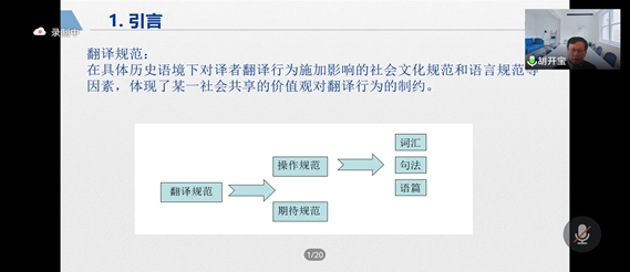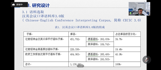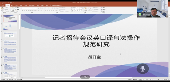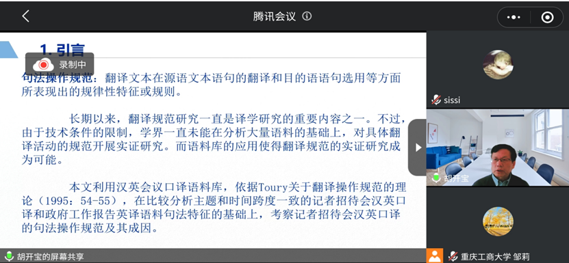 1月14日上午,应tyc5997太阳集团邀请,上海外国语大学语料库研究院经理、博士生导师胡开宝教授通过腾讯会议作了题为“基于语料库的记者招待会汉英口译句法操作规范研究”的讲座。讲座由副经理邹莉主持,公司师生370余人参加了此次讲座。