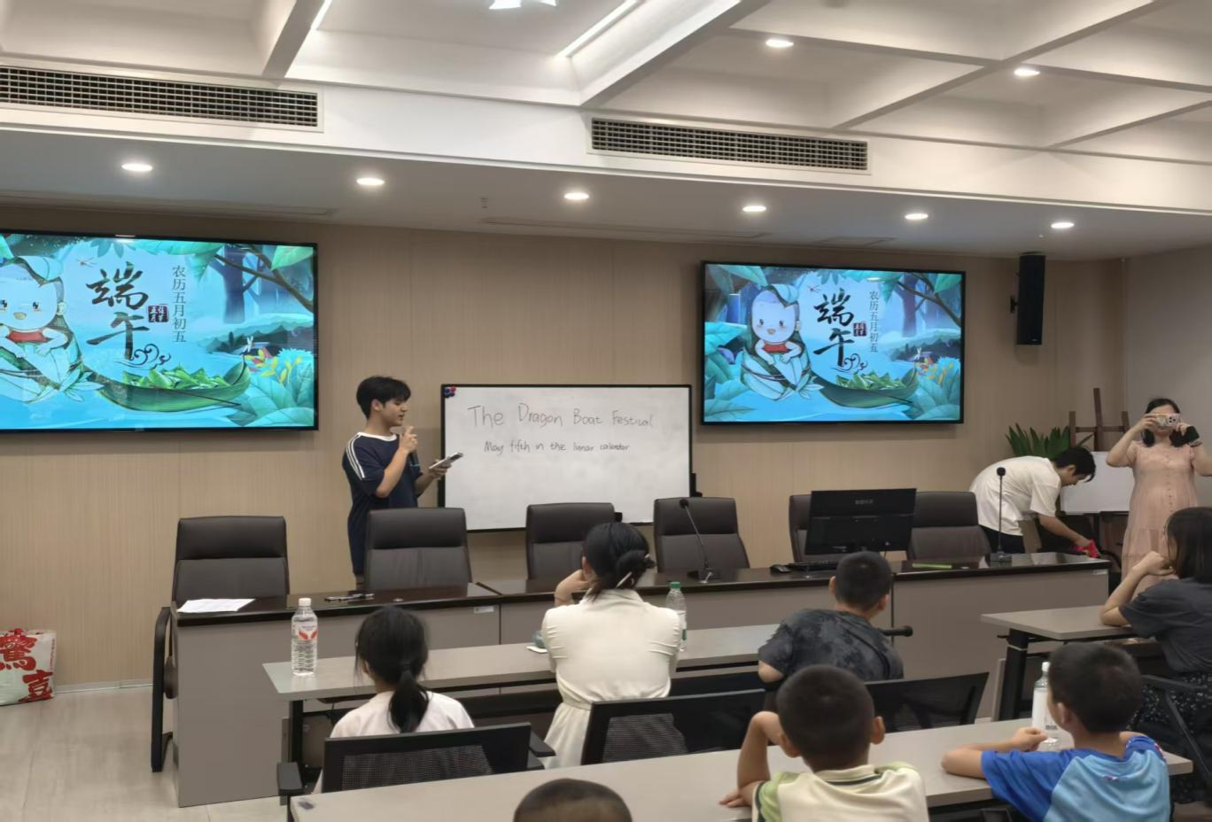 活动伊始,志愿者们化身传统文化小讲师,借助精心制作的生动PPT动画与妙趣横生的故事,向小朋友们娓娓道来端午节的起源。从纪念爱国诗人屈原的悲壮故事,到古时人们驱邪避疫的习俗渊源,每一个细节都深深吸引着孩子们的目光。志愿者们充分发挥英语专业优势,用简单易懂的英语词汇和句子描述部分内容,让孩子们在接触英语的同时,加深对传统文化的理解,真正实现了语言学习与文化传承的有机融合。在随后的互动问答环节中,"粽子一般用什么叶子包裹""五彩绳有什么寓意"等问题一经抛出,小朋友们纷纷踊跃举手抢答,现场气氛热烈非凡,展现出他们对端午知识的浓厚兴趣和积极探索的精神。进入手工实践环节,整个活动现场变成了创意与欢乐的海洋。在折纸区,志愿者们耐心细致地指导小朋友们制作简易粽子,一张张彩纸在孩子们的小手中翻转折叠,不一会儿,形态各异的"小粽子"便诞生了;制香囊区里,小朋友们在了解艾草等香料的驱蚊功效后,兴致勃勃地开始自主填充香料、缝制香囊袋,不一会儿,一个个散发着淡淡清香的香囊便制作完成;编五彩绳区更是热闹非凡,孩子们在志愿者的帮助下,用五色丝线灵巧地编织着手绳,五彩的丝线在指尖翻飞,编织出的不仅是精美的手绳,更是对美好生活的向往。活动尾声,每组推选1 - 2件作品进行展示。小朋友们纷纷走上台,自信地分享自己的制作心得,现场欢声笑语不断。此次活动通过寓教于乐、沉浸式体验的方式,让社区儿童深入感受了端午习俗的独特魅力,在他们心中播下了传统文化的种子,有效增强了他们的文化认同感与民族自豪感。