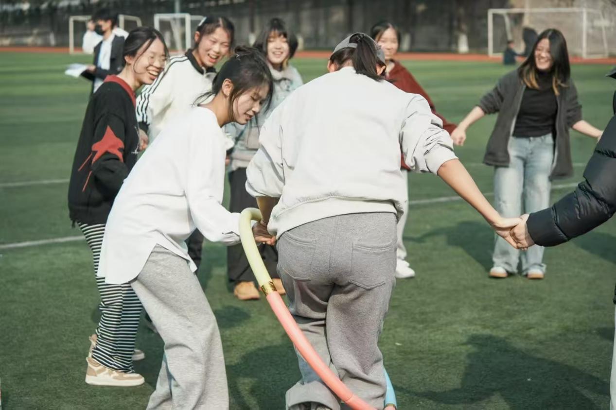 热身环节结束后,各项趣味竞赛轮番登场、有序推进。首个亮相的“呼啦圈传递”项目中,各队队员手拉手紧密相连,在不松手的前提下,将呼啦圈沿队列依次穿过每位队员身体,最终传递至队尾。该项目以团队协同为核心,既考验队员的身体柔韧性与肢体协调性,更注重团队内部的即时沟通、灵活策略调整与队员间的默契配合。现场,各队队员相互鼓劲、机智应变,竞争氛围热烈而融洽,充分展现了协作的力量。