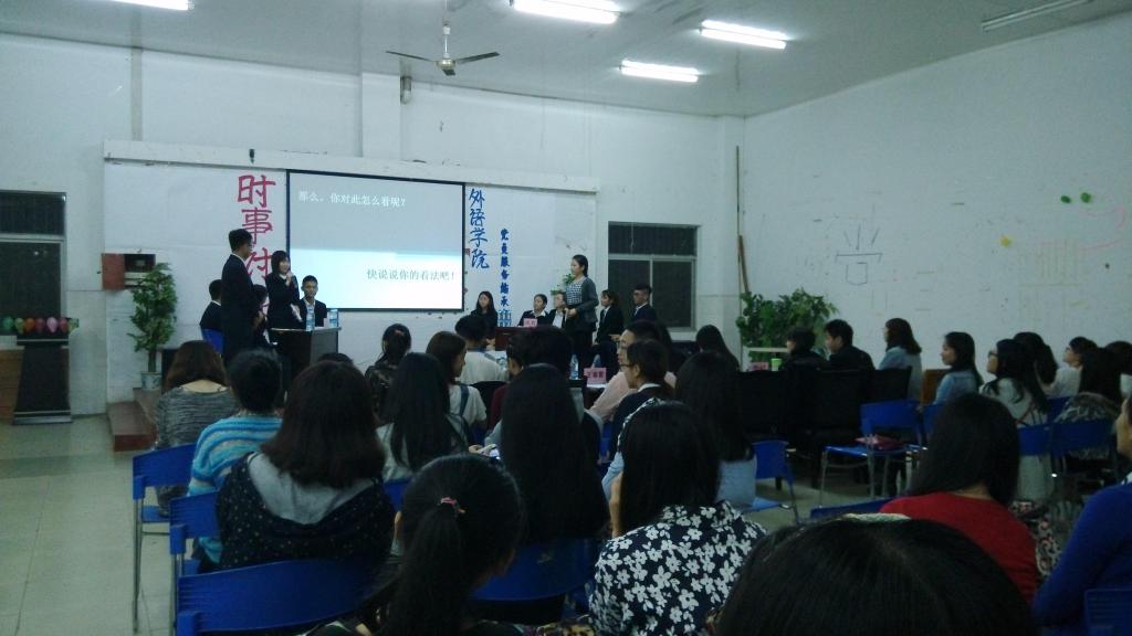 2014年10月31日晚,外语公司党员服务站社会实践部在外语活动中心成功举办了以辩论赛为形式,主题为“境外剧热播的利与弊”的时事讨论活动。本次活动特邀请了南16A3党员服务站指导老师黄志婕,大自委宣策代表刘念、刘雪龙、钟紫凡,外语公司党员服务站前站长王春雷、刘颖,现任站长张承诚、乔红、张小晓以及社会实践部前任部长陈宇轩作为此次活动的嘉宾。