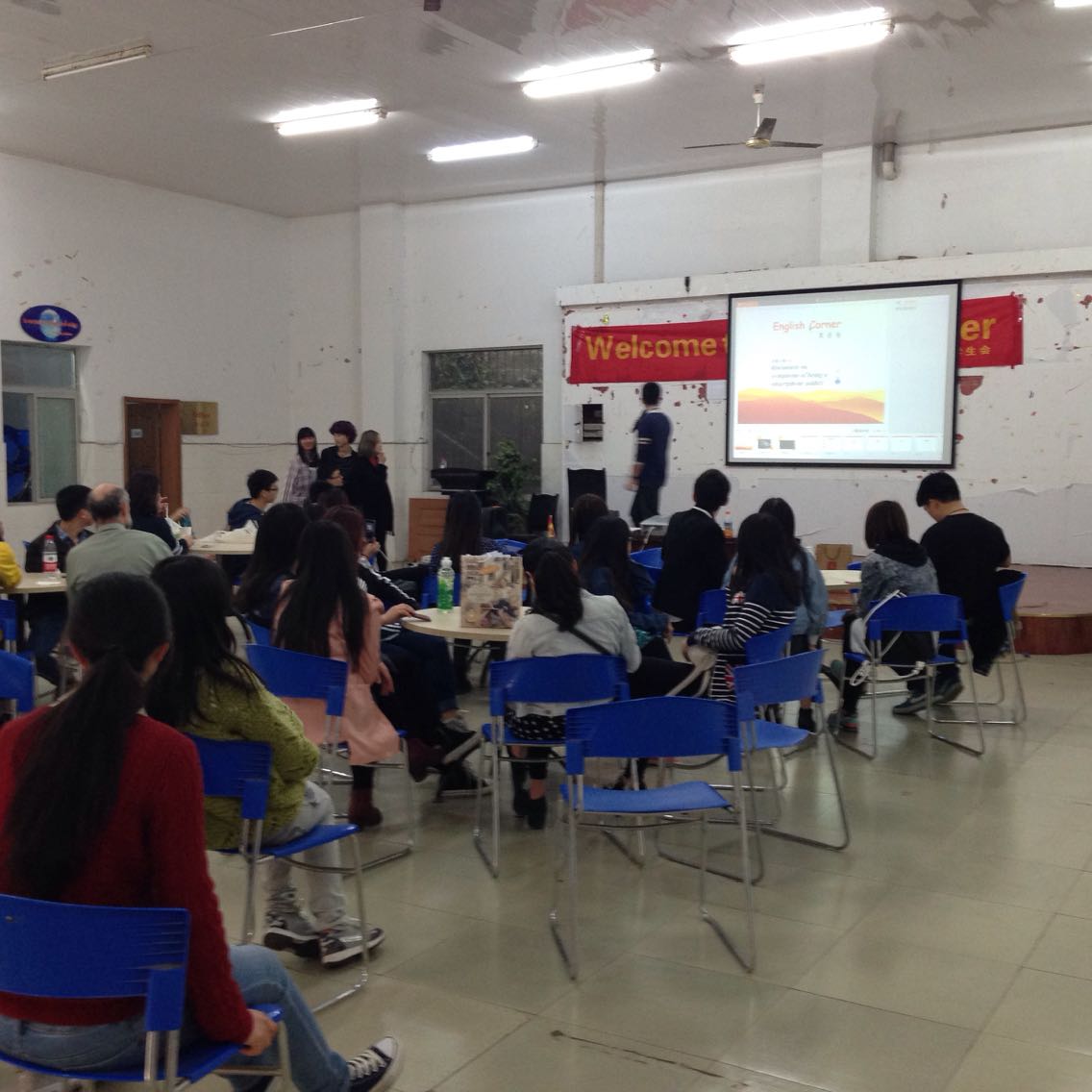 3月25日周三晚6:30,伴着落日余晖,本学期第一次英语角拉开帷幕。本次活动由外语公司分团委员工会学习部主办。来自工商大学的各个公司的英语爱好者齐聚外语活动中心,与外教、职工们共同感受中外文化的交流与碰撞。
