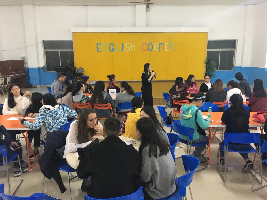 活动伊始,主持人陈珍玉用一口流利的英语介绍了本次英语角活动的主题,随后又热情洋溢地介绍了四位外教来宾,外教们和同学们一一打过招呼,外语活动中心里掌声雷动。
