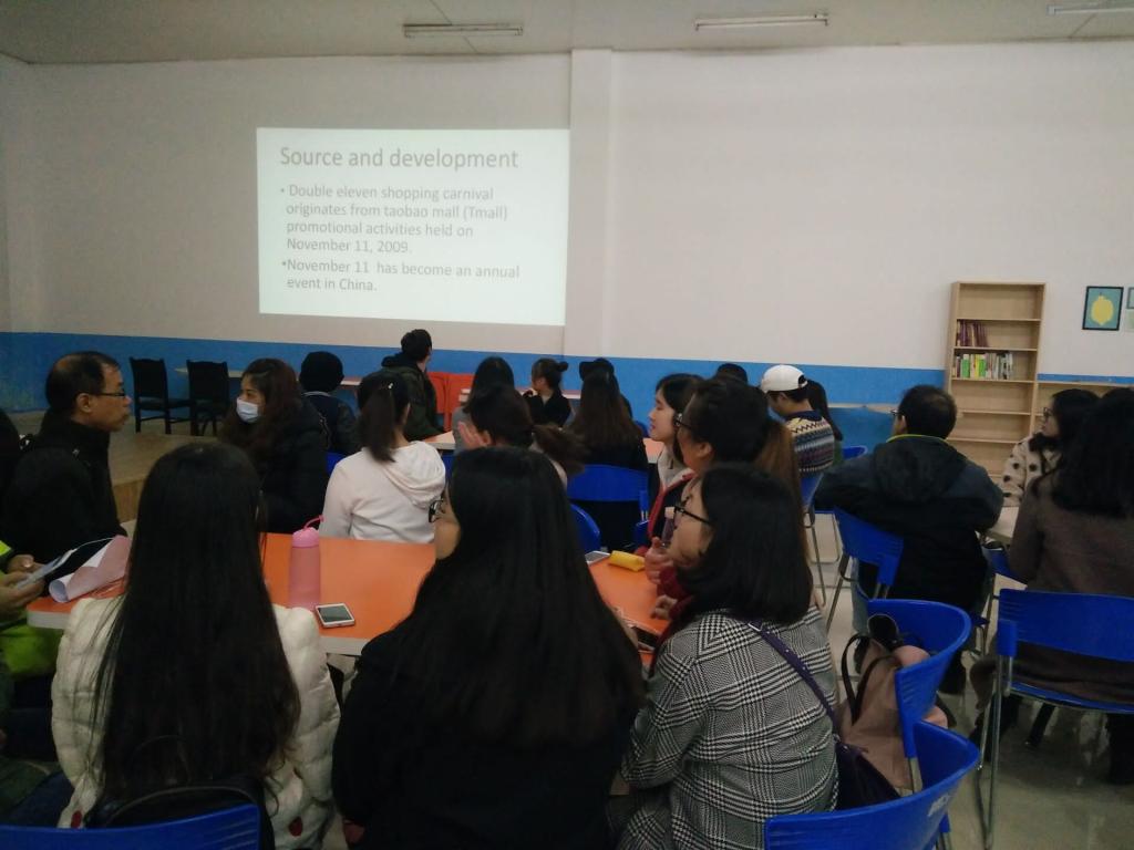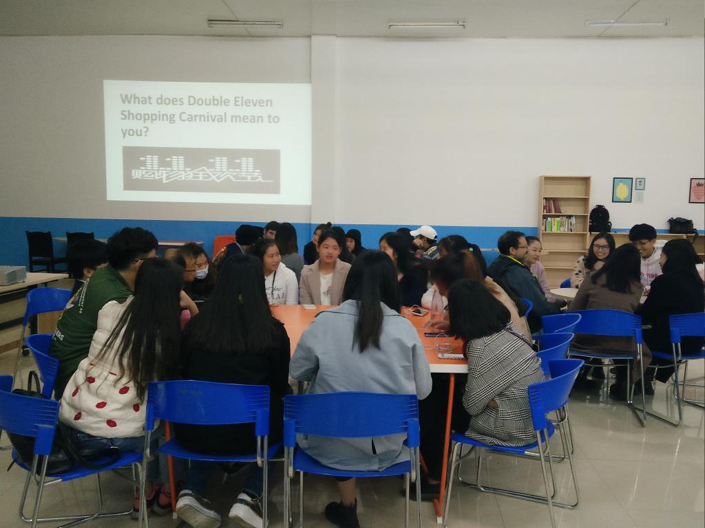 活动开始,主持人先向大家阐述本次活动主题“What does Double Eleven Shopping Carnival mean to you?” ,介绍了双十一购物狂欢节的起源和发展,以及从2009年到现在,在双十一购物狂欢节中,天猫、淘宝的一些交易数据。随后,外教Buzz与大家分享了国外的双十一与国内有何不同。 接下来进入Free talk环节,同学们就本次活动主题进行了自由讨论,纷纷发表自己的看法。部分同学在节前早已物色到不少“好货”,而另一部分同学则表示双十一的折扣吸引力并不大,并不打算参与“疯抢”。此外Justin还和大家分享了一些与网购相关的英语表达方法,在场的同学纷纷表示十分受用。整个英语角持续了一个半小时,直到活动结束,大家对这次小小的“节前预热”仍是意犹未尽。