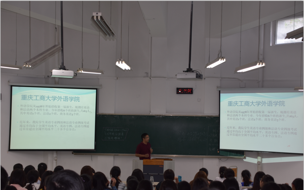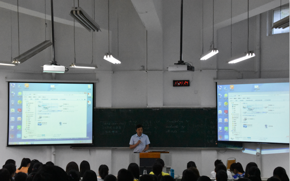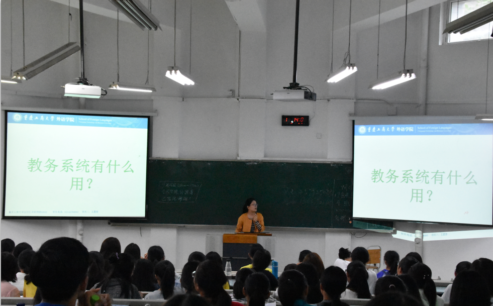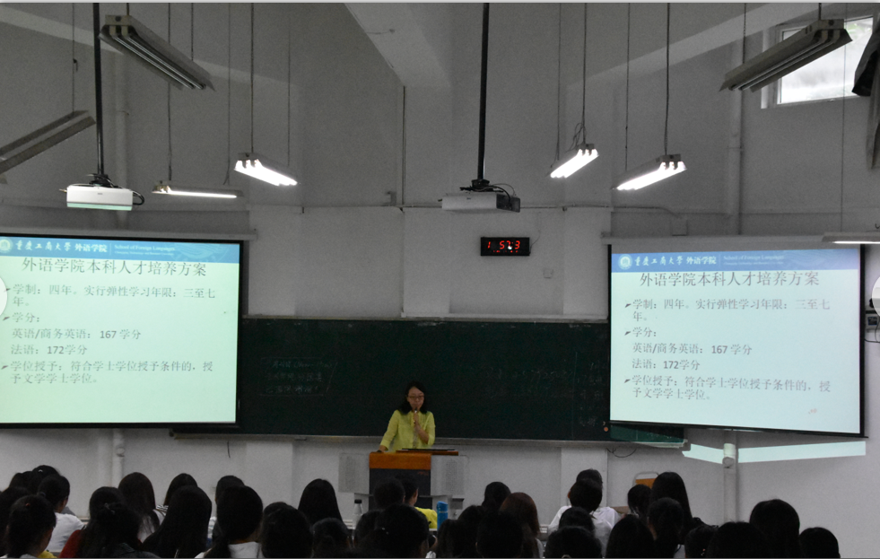 随后,戴运财经理上台发言,为同学们讲述公司外语专业的背景与前景,告知同学们外语专业的发展方向,学习策略,以及公司雄厚的团队力量。戴经理告诉同学们在今后的学习中要厚基础,勤实践,多思考,敢创新,以成为一个优秀的复合型人才;与此同时,陈晓东书记和陆嘉书记就怎样进行有效学习提出了宝贵意见。紧接着,副经理周琳对公司外语专业人才培养方案进行了简单介绍,并告知同学们专业课程结构以及实践教学环节等重要信息;教师王露茜对公司教务系统进行了介绍,告知同学们教务系统的使用方法等。最后,曹鹏老师和宋敏子老师简单介绍了如何进行专业学习的方法,并与同学们分享了宝贵的学习经验与心得,以鼓励同学们积极认真学习,将来成为祖国需要的高素质人才。