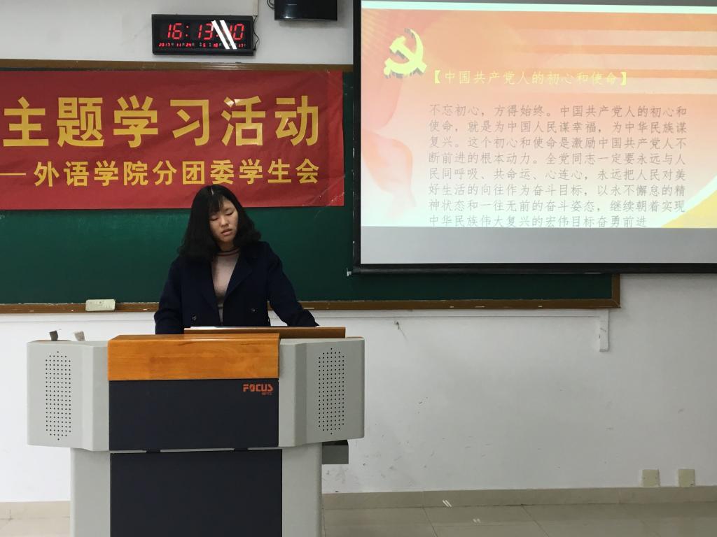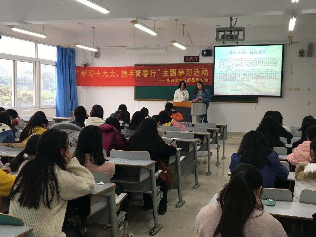 2017年11月24日下午4点,外语公司分团委员工会“学习十九大,携手青春行”主题学习活动在南岸校区07410圆满举行。本次会议由外语公司分团委副书记雷雨佳主持,员工会主席唐丽、副主席唐垒以及分团委员工会的全体干部干事们共同参与。