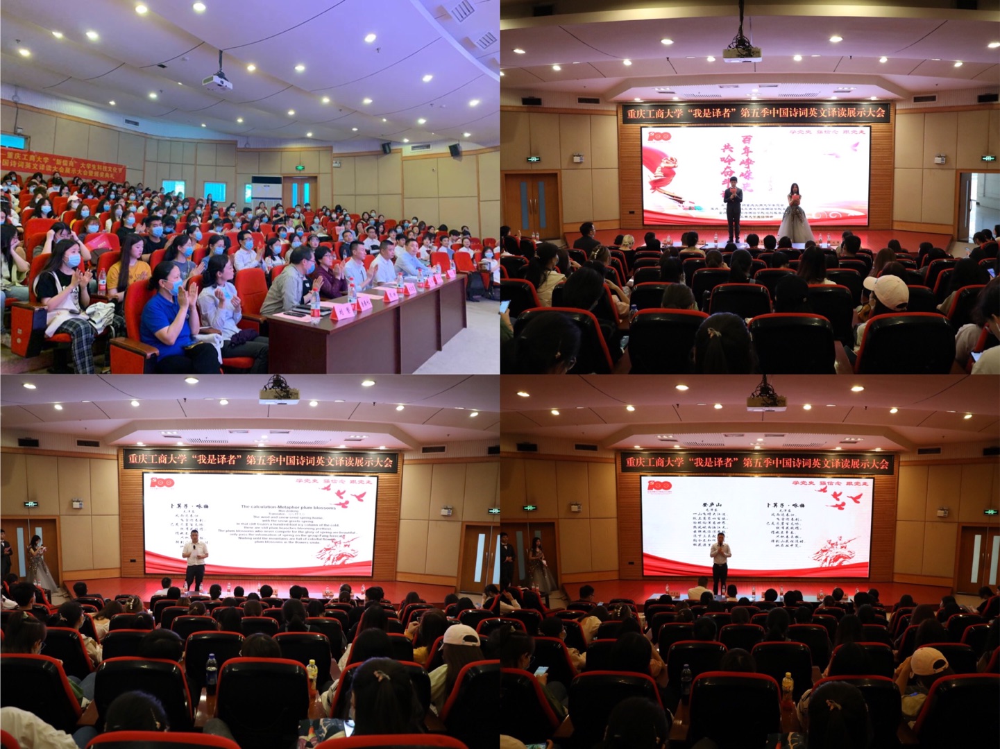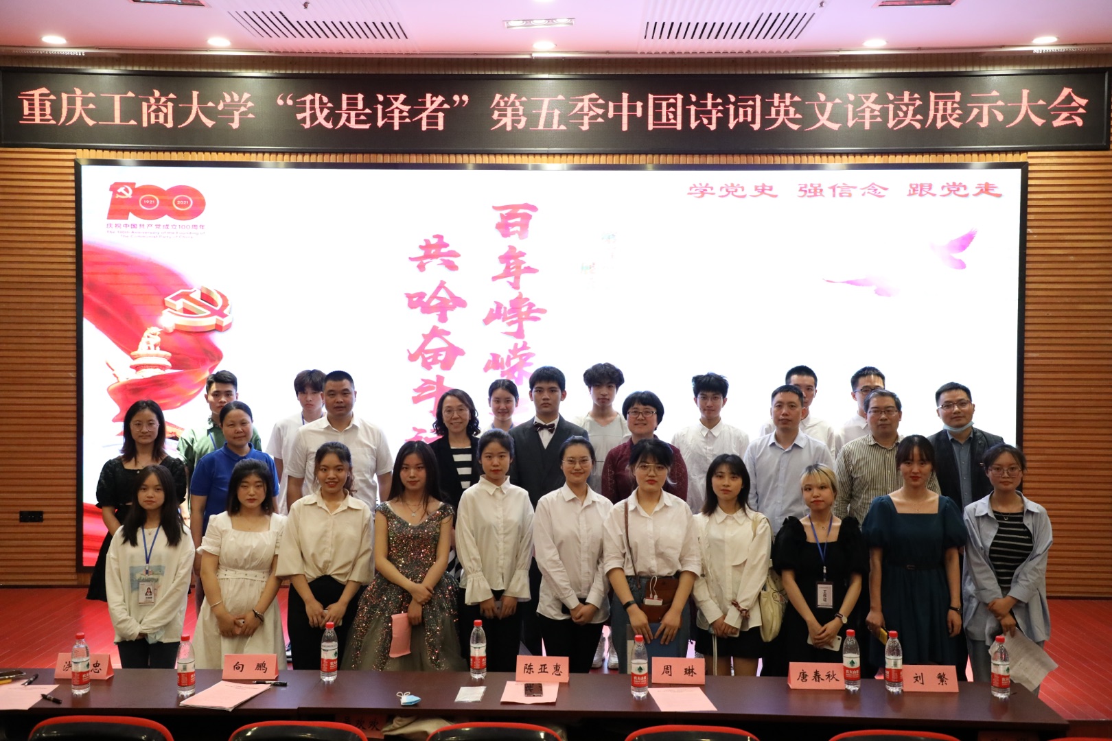2021年4月30日下午,由共青团tyc5997太阳集团委员会主办,tyc5997太阳集团分团委员工会、公司党员服务站、英语协会联合承办的“百年峥嵘史,共吟奋斗诗”第五季中国诗词英文译读展示大会暨颁奖典礼在南岸校区7200教室成功举行。tyc5997太阳集团党委学工部副部长陈亚惠、校团委老师陈琛、公司党委书记唐春秋、经理周琳、党委副书记吴欢欢、副经理刘繁、分团委指导老师丁亮,以及来自全校不同公司近300名同学参加了本次活动。本次活动首次采取双导师点评的方式,tyc5997太阳集团英语系向鹏老师从专业角度点评翻译技巧和意境,马克思主义公司中国近代史纲要教研部主任洪富忠老师为同学们讲解党史诗词的背景和历史故事。