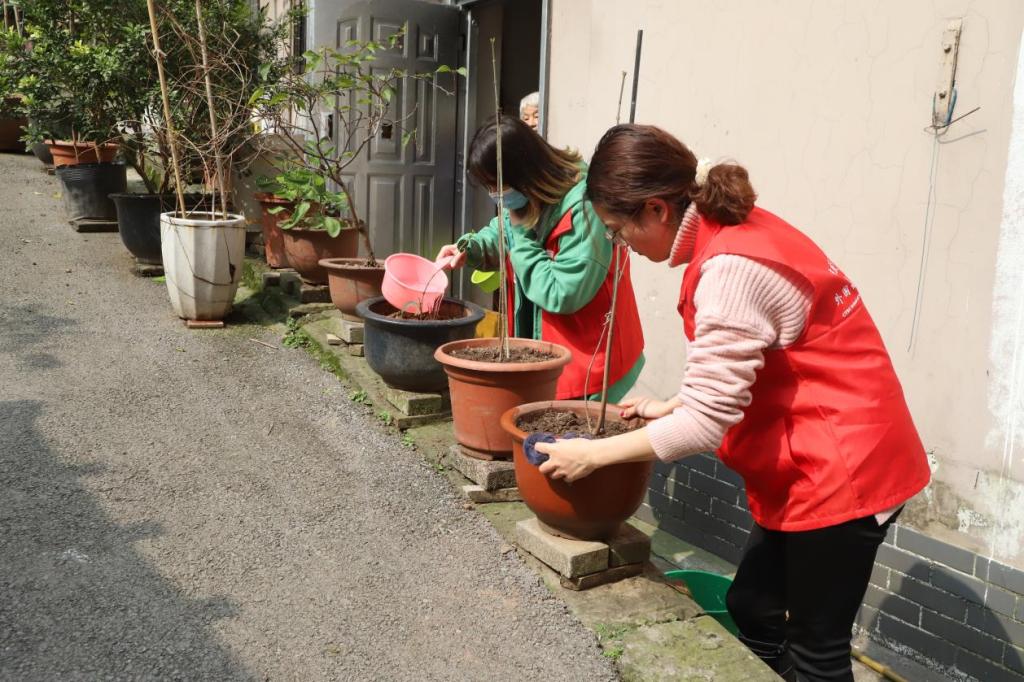 志愿者为独居老人整理花坛