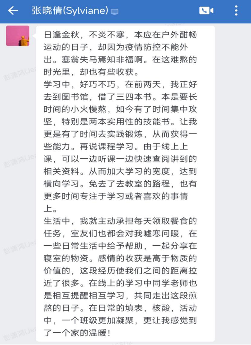 突如其来的疫情打乱了所有人的脚步,但同学们却都以良好的心态面对它,在此期间,有的同学感受到了人间真情,收获到了室友之间的友情;有的同学利用这个机会进行专业知识学习,提高自己专业素质;有的同学取餐时与送餐老师相互关心,增进了师生之间的情谊……