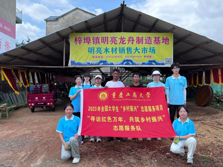 图为志愿服务队与当地龙舟制作匠人在明亮龙舟制作基地的合照