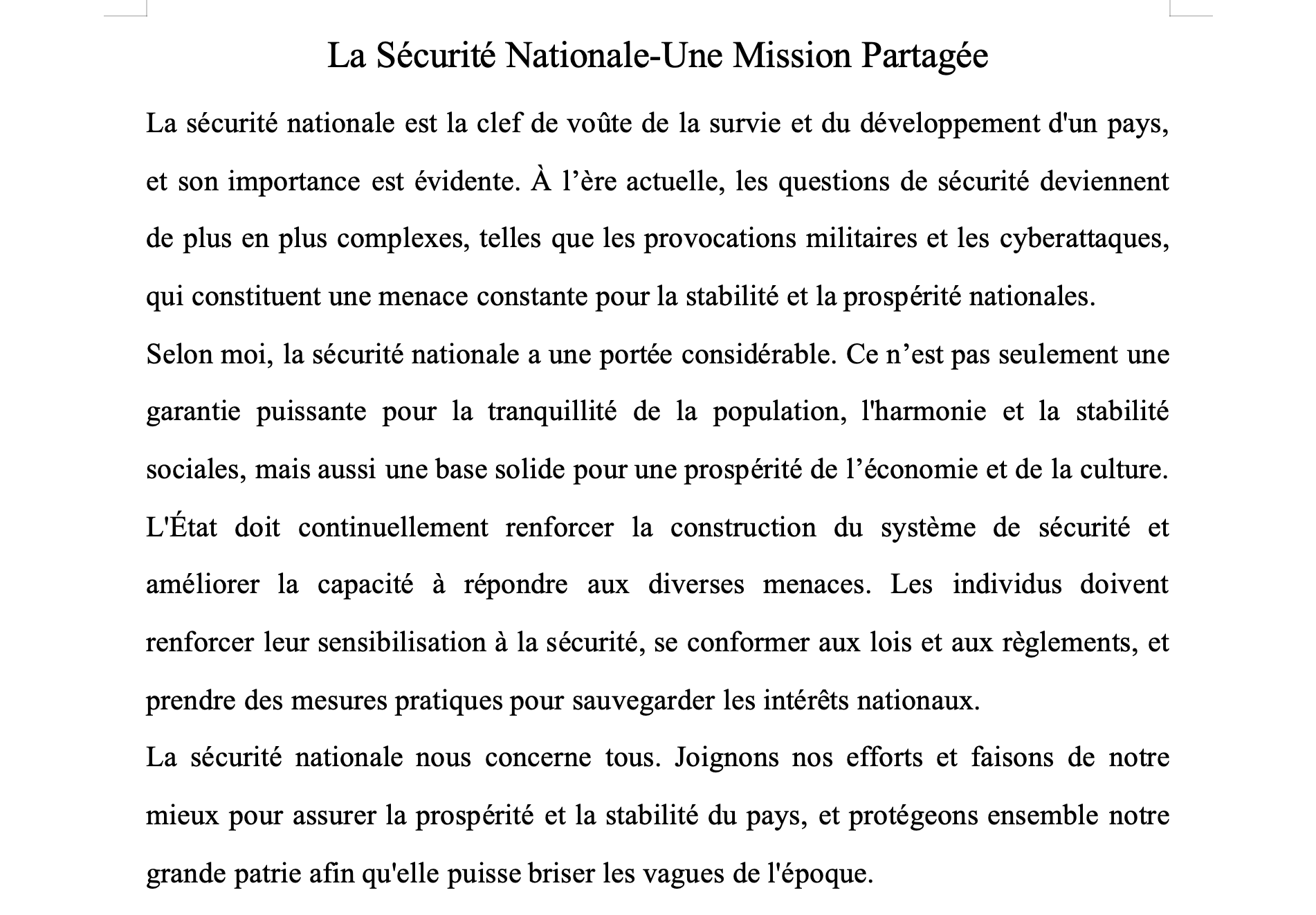 本次活动结合“一站式”员工社区主题系列活动相关要求,聚焦新时代国家安全取得的重大成就,并以总体国家安全观为引领,征集体现国家安全理念的外语征文,收到来自不同公司同学的20份投稿,参赛同学详细阐述和平与国家安全重要性,并强调个人在维护国家安全方面的责任,特别强调要加强对国家安全的敏感性和警惕性。