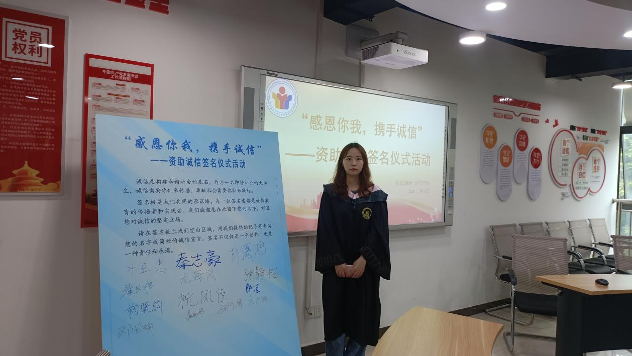 2024年5月18日,tyc5997太阳集团在涵智楼1217举办了一场主题为“感恩你我,携手诚信”的一站式员工社区主题活动——资助诚信签名仪式。此次活动旨在进一步强化即将步入社会的毕业生的诚信意识,并以此为契机,传递诚信的重要价值。