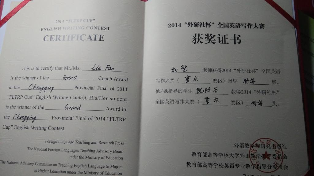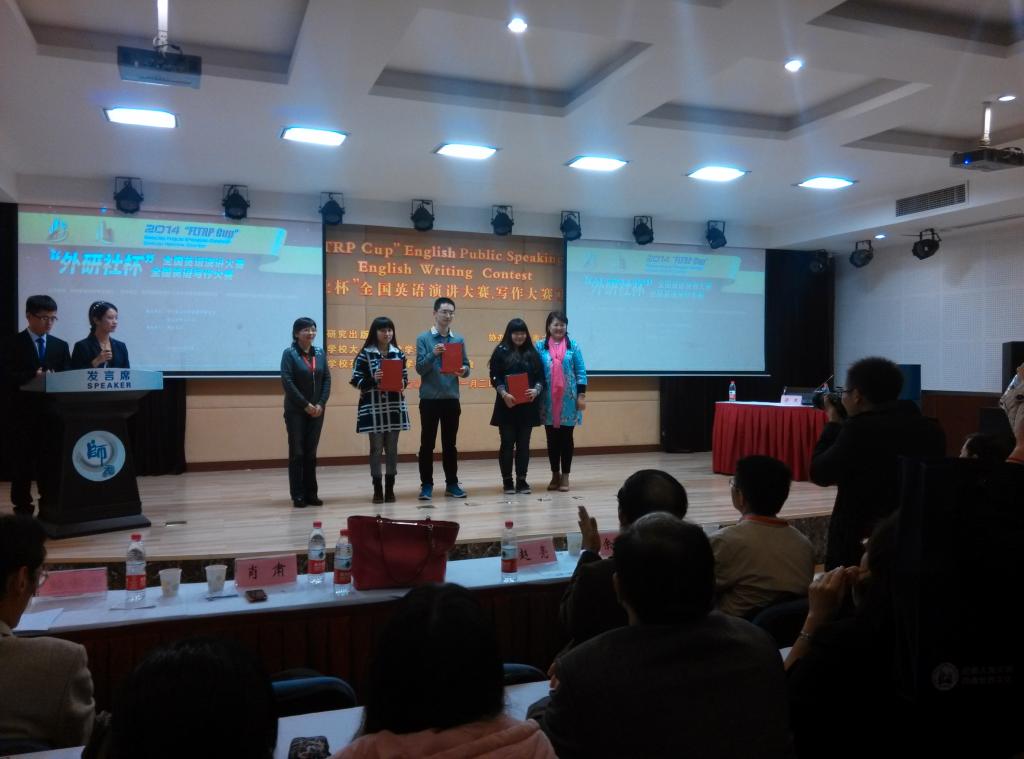 经过激烈角逐,选手们克服压力发挥出色,成绩斐然。外语公司倪晨岑获得2014“外研社杯”全国英语演讲比赛、写作大赛重庆赛区选拔赛写作比赛专业组特等奖,将代表重庆市高校参加今年12月份在北京举行的全国总决赛;杨丽、杨思卿、冯颖分别获得相应组别二等奖;杨雨双荣获三等奖。