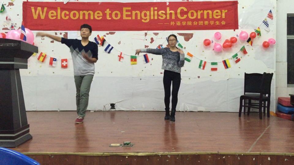 6:30活动准时开始,来自2014级英语班的刘昊同学和13级法语班的何怡梅同学首先为大家带来了一场精彩绝伦的拉丁舞表演,瞬间带动了全场气氛,观众席传来一片热烈的掌声。紧接着是有趣的“抢板凳”和“猜歌名”的游戏环节,随着游戏的进行,同学们热情高涨,笑声阵阵。最后活动随着“free talk”的结束而顺利完满的结束了。
