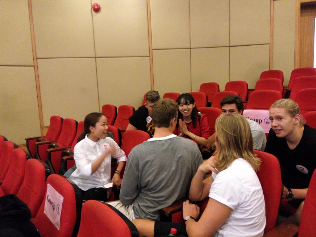 武术表演结束后,职工们在志愿者的陪同下前往7200会议厅参加中丹员工座谈会。本次座谈会由外语公司牛婧懿老师主持。座谈会开始,韩艳处长对丹麦职工的到来表示热烈欢迎,同时也对重庆及公司的基本情况进行了介绍。随后曹俊老师带来中国文化讲解,京剧、茶艺、变脸、龙图等,源远流长、博大精深的中国文化吸引着在座的每一位职工。讲解过后是志愿者们精心安排的“Coffee Break”环节,尽管是休息时间,职工们依然兴趣不减地同志愿者一起讨论两国间的文化差异,共同分享各自的学习生活。最后是每个小组的总结发言,他们分别就餐桌文化、教育体制、日常交往等方面进行对比总结,切实做到了寓乐于学。最后,为期一天的交流活动在两江夜游后落下帷幕。