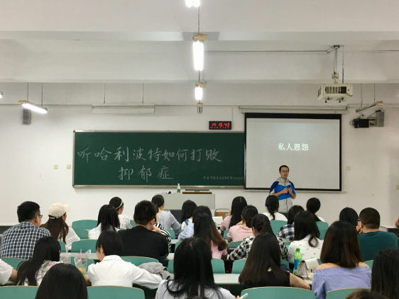5月12日下午,外语公司党员服务站“文明修身,阳光心理”活动之“听哈利波特如何打败抑郁症”讲座在07104成功举办。本次讲座有幸邀请到了电子图书馆编辑张星老师作为主讲嘉宾,外语公司大一大二各班代表以及党站大部分成员都参加了本次活动。