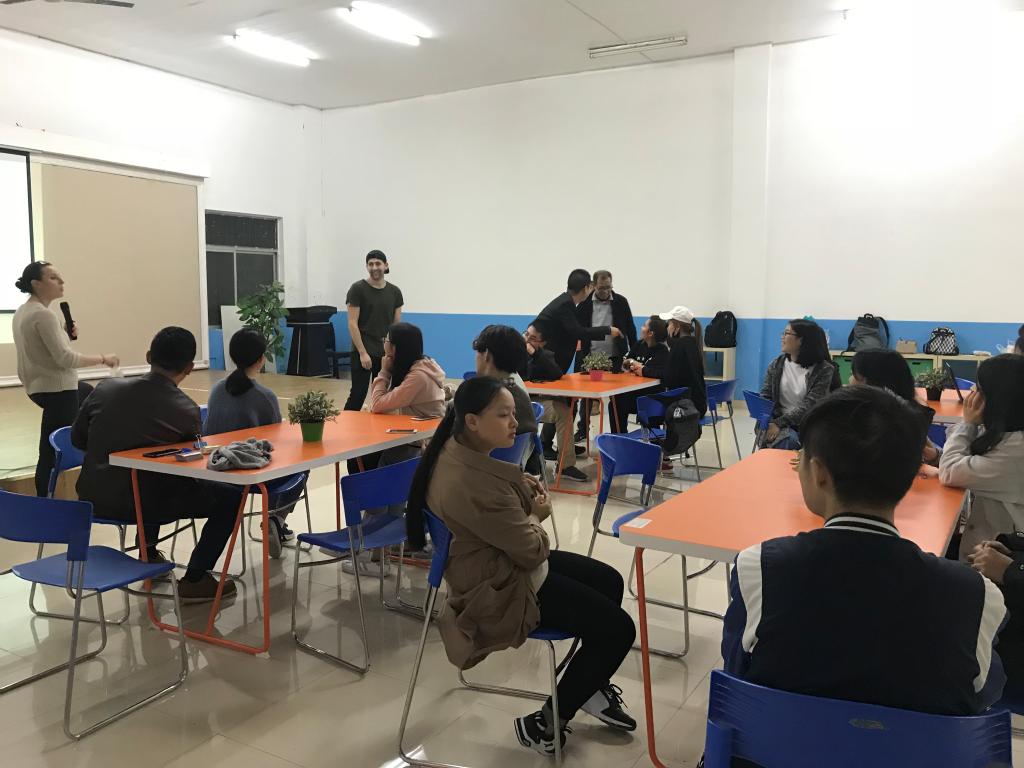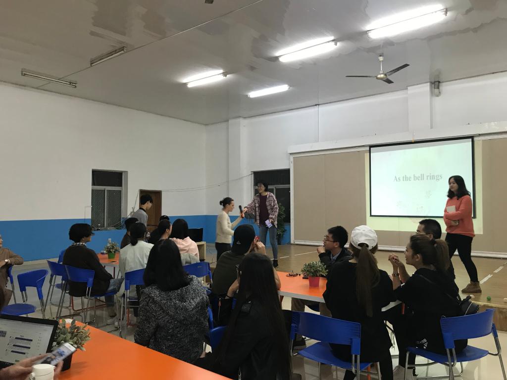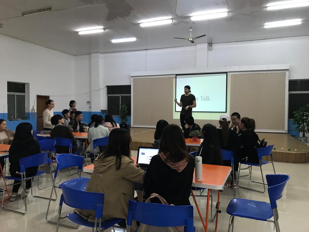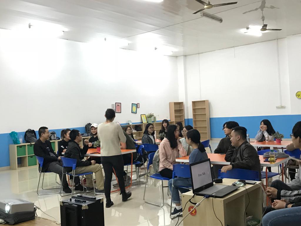 2018年10月16日下午18:40,外语公司满天星义工志愿者协会在南岸校区外语活动中心,准时开展了主题为“课间好时光”的英语角活动。活动由向薇和樊鑫作为主持人,共有三名外教Sam、Brittany和Cameron作为嘉宾以及众多英语热爱者参与。
