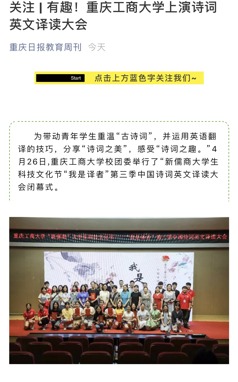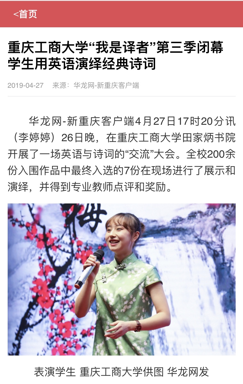 诗词有尽而意无穷,译读虽短却深入人心。“我是译者”自举办以来,反响热烈,吸引了众多热爱中国诗词文化的员工参加,为热爱英语的员工提供了一个展现自我的平台。第三季的“我是译者”活动经过四个月的比赛选拔和筹备,主办方从两百余份入围作品中评选出了12个获奖作品。本次活动也得到华龙网、重庆日报教育周刊的报道。