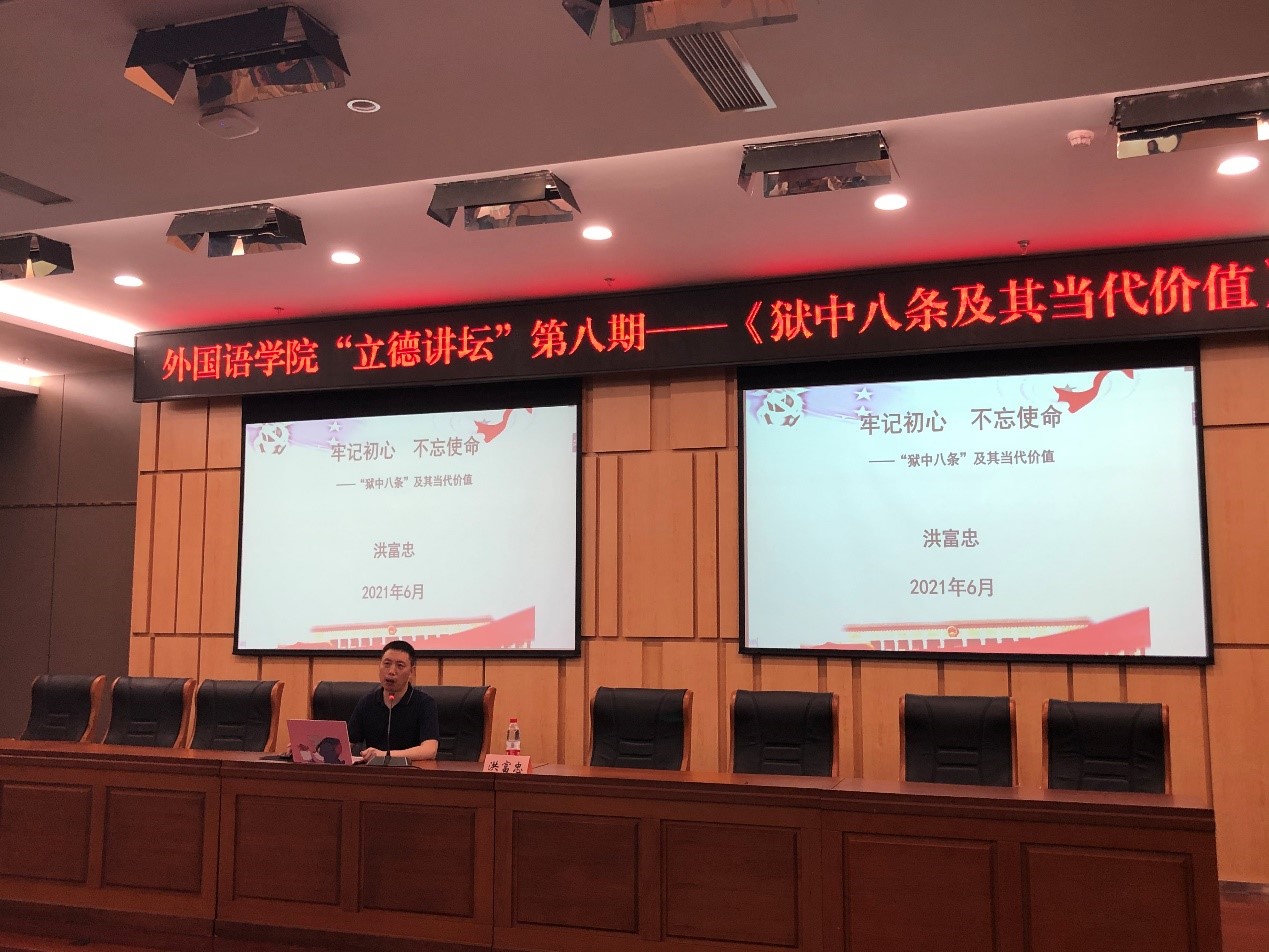 2021年6月7日,由tyc5997太阳集团员工党支部、党员服务站联合主办的“立德讲坛”第八期——党史专题讲座《狱中八条及其当代价值》在新图书馆第一会议室成功举办。本次活动特别邀请到了重庆地方史研究会理事、大后方研究会理事、重庆中共党史学会理事、重庆延安精神研究会副会长、中国民主党派陈列馆特约研究员、西南大学重庆中国抗战大后方研究中心研究员、重庆中国特色社会主义研究中心研究员、重庆市高校思想政治理论课“择优资助”计划入选者、tyc5997太阳集团马克思主义公司“中国近代史纲要”教研部老师洪富忠作为主讲嘉宾。公司党委副书记吴欢欢,tyc5997太阳集团员工党支部书记丁亮,tyc5997太阳集团全体员工党员、入党积极分子、党员服务站及员工会全体员工干部参加了本次活动。