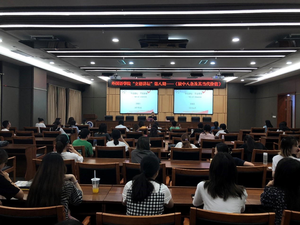 活动中,洪富忠老师以“不忘初心,牢记使命”为主题对“狱中八条”及其当代价值进行了较为详细的分析和讲解。讲座内容主要分为三个部分:首先是对“狱中八条”产生的历史背景的具体分析,然后是对“狱中八条”的再现与内容的详细讲解,最后是对“狱中八条”的当代价值的总体概括。在对“狱中八条”产生的历史背景进行分析时,洪富忠老师从川东地下党组织的组建及破坏、狱中斗争的反思等方面具体讲解并分析了当时的历史背景。在讲到对狱中斗争的反思时,洪富忠老师结合了当今社会出现的某些对江竹筠同志的不实网络评论,较为详细的讲述了江竹筠与其丈夫彭咏梧的真实历史故事并分析了现今社会中历史虚无主义的危害同时也提醒了参会人员正确鉴别网络信息保持正确历史观。在对“狱中八条”的再现和内容进行讲解时,洪富忠老师从“狱中八条”的再现过程和具体内容两方面出发,并结合当时的一些典型实例对“狱中八条”关于防止领导成员的腐化和关于加强党内教育和实际斗争的锻炼等具体内容进行讲解。例如在对第五条切勿轻视敌人时,洪富忠老师通过对“红旗案例”中陈柏林因轻信反动派特务的假意投诚而对党组织造成了损失和对现今某些“抗日神剧”的不良影响的分析,表明了此条的科学性。洪富忠老师分析道“狱中八条”更多的是对党组织教学的总结和作为党内领导干部建设失败教训。在对“狱中八条”的当代价值进行概括时,洪富忠老师指出每个人在对“狱中八条”的学习中都有各自的收获,并总结道党的建设永远在路上,需要持之以恒,不断向前走。