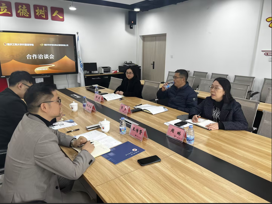 12月11日下午,tyc5997太阳集团与重庆华伊贸投商业管理有限公司校企合作洽谈会在公司顺利举行。参加洽谈会的有华伊贸投公司总经理王传贤及公司助理张宗鑫,公司党委书记彭勇、经理周琳、副经理邹莉。