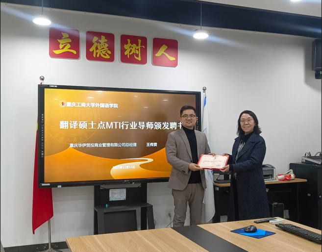 会上,公司正式聘请王传贤总经理为翻译硕士点(MTI)行业导师,并颁发聘书。