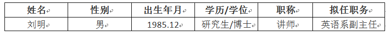 因公司工作需要,在英语系中遴选英语系副主任1名,经2024年2月28日公司党政联席会研究,决定拟聘刘明老师担任英语系副主任(院聘)。现予公示。