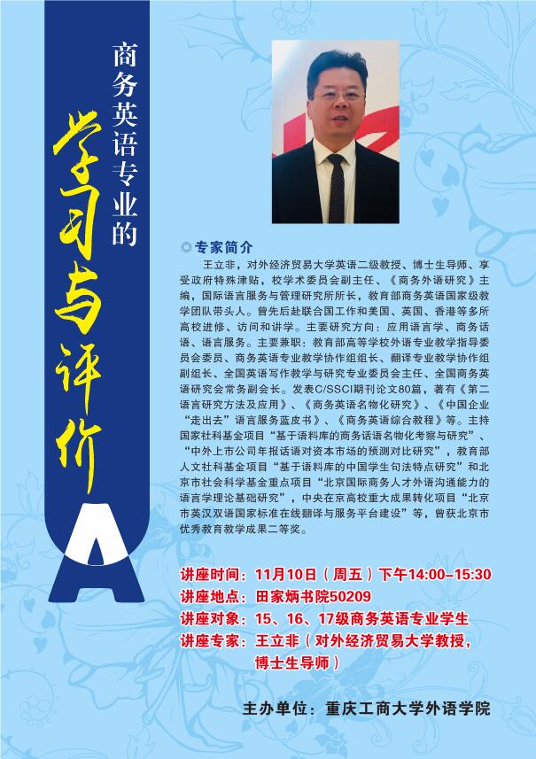对外经济贸易大学王立非教授将于11月10日下午2点来公司田家炳209作学术讲座,欢迎全校师生参加!